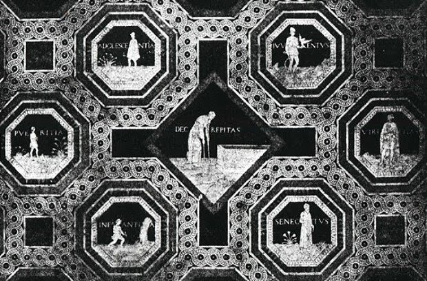 This is a depiction of the Seven Ages in the tile flooring of the Siena Cathedral, no doubt described to Shakspere in a London tavern by a gin-swilling art-enthusiast mariner. For discussion of sources for the idea of The Seven Ages of Man, see the article by Christopher Paul, “This Strange Eventful History: Oxford, Shakespeare, and The Seven Ages of Man.” The Shakespeare Oxford Newsletter 38.3 (Summer 2002): 1, 12-15, 24.