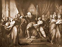 It is “as if he had regressed to the posture and position of a child” (Garber 653). Lear will distribute the kingdom in accordance with his daughters’ public declarations of devotion for him. Goneril lays it on thick: “Sir, I love you more than words can wield the matter, / Dearer than eyesight, space, and liberty” (I.i.55-56). These three things will be taken away during the course of the play. Regan lays it on thicker: “I profess / Myself an enemy to all other joys” (I.i.72-73). When Lear turns to Cordelia — “what can you say to draw / A third more opulent than your sisters’? Speak” (I.i.85-86) — she is laconic: “Nothing, my lord.” Perhaps “Lear’s rhetorical power itself largely renders Cordelia mute and recalcitrant” (Bloom 494). “Nothing?” “Nothing.” “Nothing will come of nothing, speak again” (I.i.87-90). Cordelia merely claims to love Lear as is filially appropriate. Lear is enraged; he rants and disinherits her. “Cornwall and Albany. / With my two daughters’ dow’rs digest the third” (I.i.127-128). The Earl of Kent comes forth: “Royal Lear, / Whom I have ever honor’d as my king” (I.i.139-140); he advises Lear that it’s a bad idea to abdicate and assures Lear that Cordelia does not love him less. But Kent just gets himself banished as Lear borrows some characteristic phrases from Queen Elizabeth: “On thine allegiance” (I.i.167) and “our vow” (I.i.168). Kent leaves nobly, hoping that the words of the two elder sisters translate into actions: “See better, Lear, and let me still remain / The true blank of thine eye” (I.i.158-159). “From this moment on, the story of King Lear is the story of the slow acquirement of that better vision” (Goddard, II 144). Gloucester returns with the King of France and the Duke of Burgundy. Cordelia now faces penury — “now her price is fallen” (I.i.197) — and she explains that she refused to flatter Lear. The lack of a dowry makes Burgundy reconsider his interests, but Lear is firm and Cordelia has no interest in someone looking only for a dowry anyway. The King of France, however, is impressed. Cordelia is realistic about her sisters’ insincerities, but wishes well to all, receiving snippy retorts from Goneril and Regan. When alone, the two vicious sisters comment on events: “‘Tis the infirmity of his age, yet he hath ever but slenderly known himself” (I.i.293-294). They agree to work together towards insuring their good fortune.