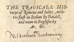 The original publication title page reads only The Tragicall Historye of Romeus and Iuliet, written first in Italian by Bandell, and nowe in Englishe by Ar. Br. Very little is known about Arthur Brooke, who is later credited with the work: although see Nina Green, “Who Was Arthur Brooke?” The Oxfordian 3 (2000): 51-70. An Arthur Brooke existed, born about 1544 and drowned early in 1564 on his way to help Protestant forces in France, but many Oxfordians consider this poem a youthful composition by de Vere, who later expanded and revised the story for the stage. See Paul H. Altrocchi, MD, “Shakespeare, Not Arthur Brooke, Wrote Tragicall Historye of Romeus & Juliet.” Shakespeare Oxford Newsletter 43.1 (Winter 2007): 22-26. The thing does seem like a youthful effort by a male adolescent going through his prudish period.